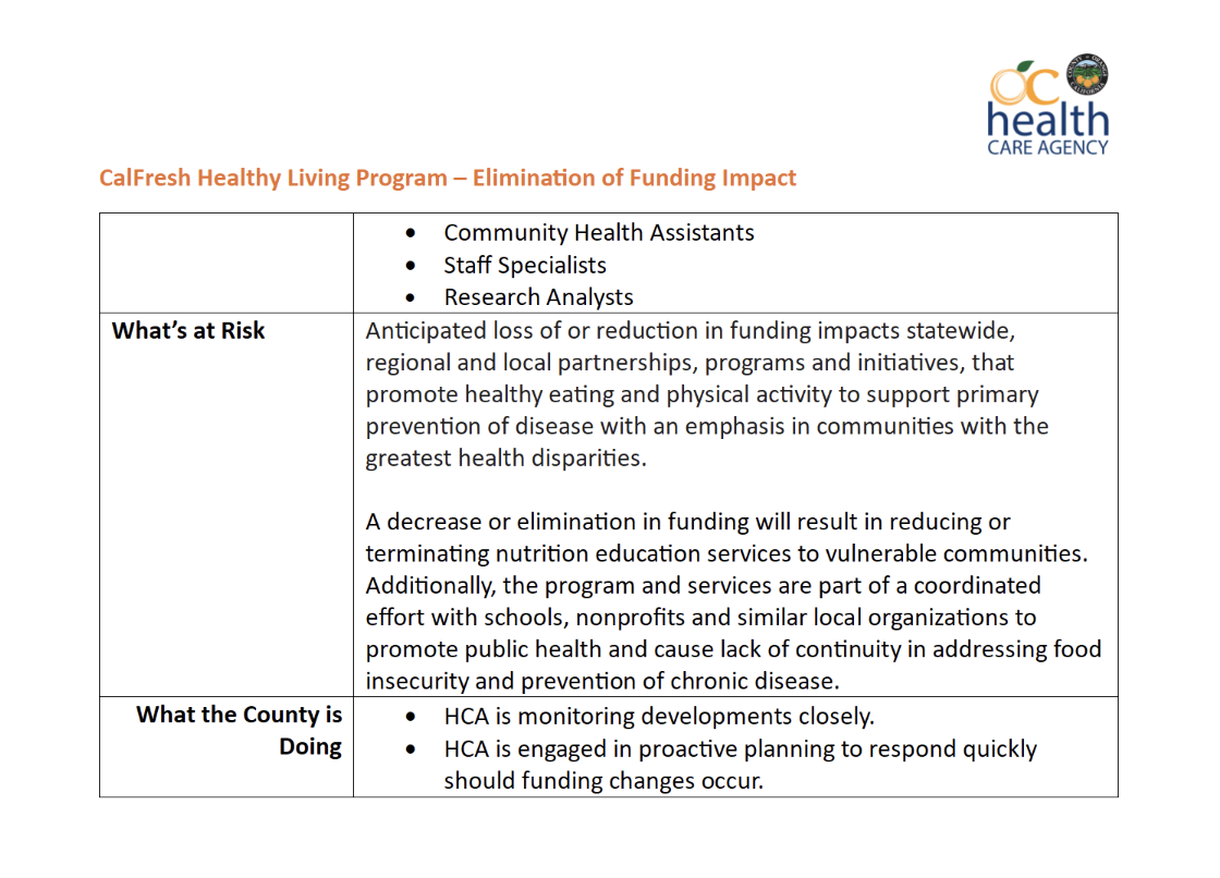 CalFresh Healthy Living Program – Elimination of Funding Impact